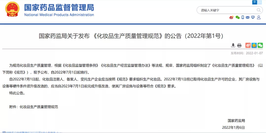 1月7日,国家药品监督管理局发布2022年的第1号文件,内容涉及《化妆品生产质量管理规范》公告及具体内容。