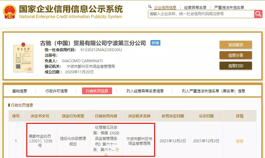 近日,古驰宁波第三分公司经营标签不合规化妆品被罚的消息在网上不胫而走。
