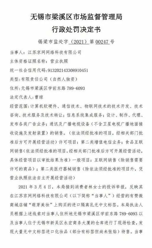 去年7月,无锡市梁溪区市场监督管理局发布一则行政处罚决定书,江苏京网网络科技有限公司(以下简称“当事人”),因销售无标签进口化妆品而被罚款约100万元。具体处罚为没收无中文标签进口化妆品21箱;没收违法所得138610.72元;罚款867206.88元。