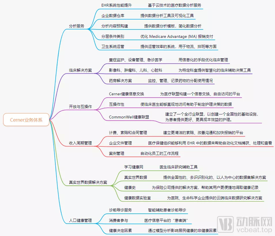 Cerner业务全布局(数据来源:根据官网数据,由动脉网合并整理)