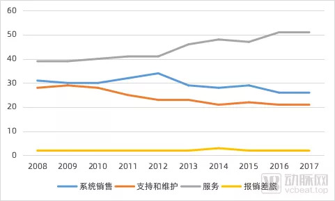 2008-2017年Cerner各业务板块变化百分比(数据来源:根据Cerner历年招股书整理)