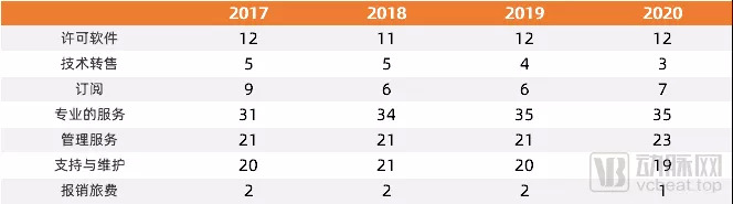 2017-2020年Cerner各业务板块营收百分比(数据来源:根据Cerner历年招股书整理)