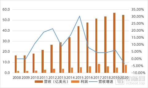 2008-2020年净利润、营收变化情况,转折从2016年开始(数据来源:根据Cerner历年招股书整理)