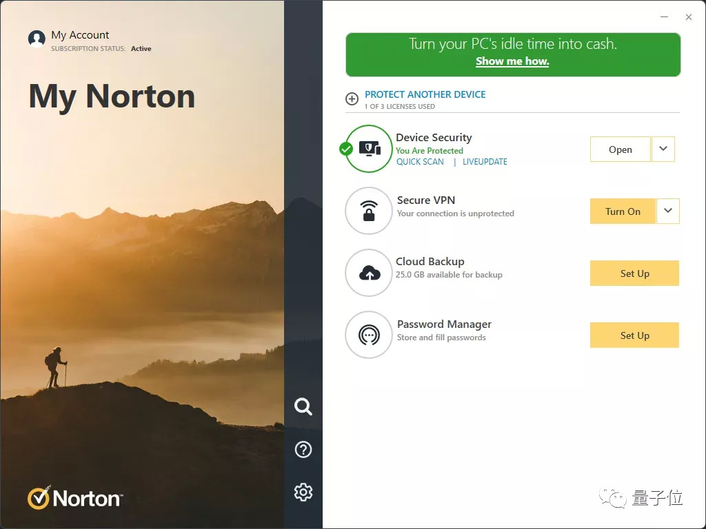 就在诺顿的主控制页上,右上绿色部分的“Turn your PC’s idle time into cash”按钮就是了。