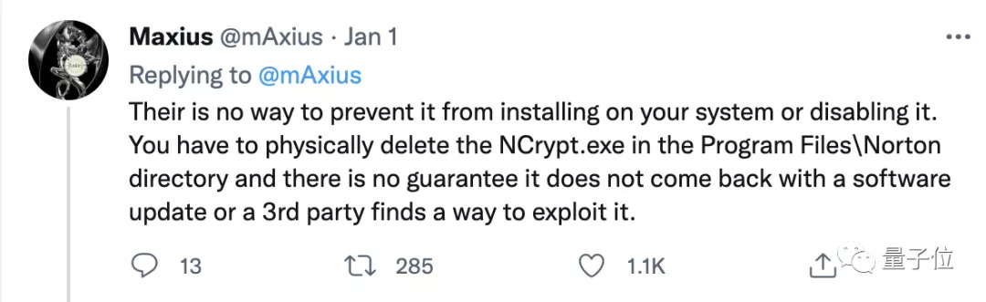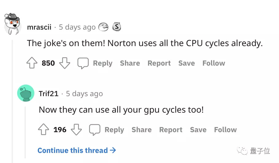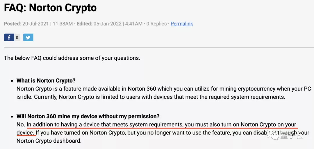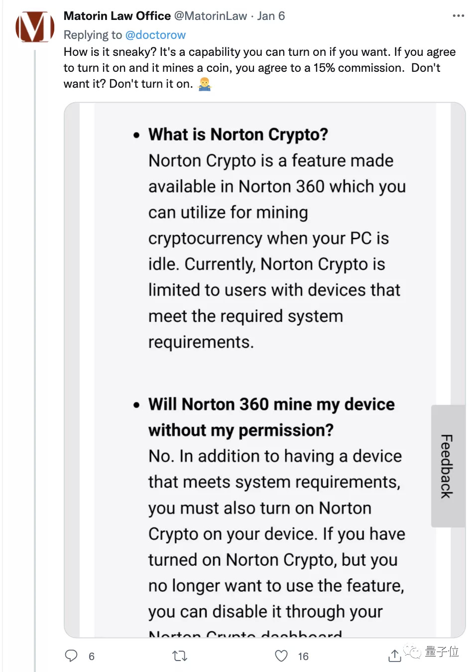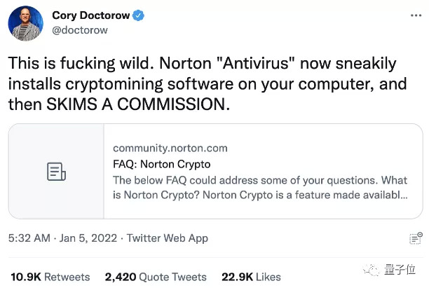 参考链接:[1]https://www.theverge.com/2022/1/7/22869528/norton-crypto-miner-security-software-reaction[2]https://twitter.com/doctorow/status/1478479483585933312