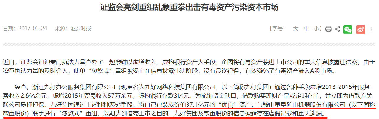 证监会官网2017年《证监会亮剑重组乱象重拳出击有毒资产污染资本市场》一文显示,九好集团通过将自己包装成价值37.1亿元的“优良”资产,与鞍重股份联手进行“忽悠式”重组,以期达到借壳上市之目的。九好集团及鞍重股份的信息披露存在虚假记载和重大遗漏。