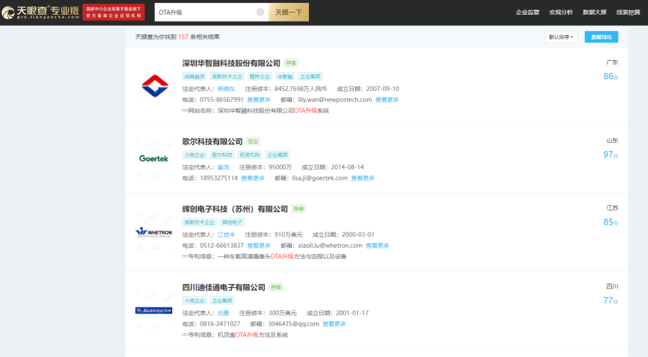 目前阶段的OTA升级技术和新能源汽车一样,仍处于培育市场的阶段,但并不意味着OTA升级不能够成为一条独立的赛道,以额外附加服务的名义进行研发和经营。从天眼查的OTA升级相关搜索中,能够发现已经有154家从事相关业务的公司,而且不小一部分企业都有着多年的积累。