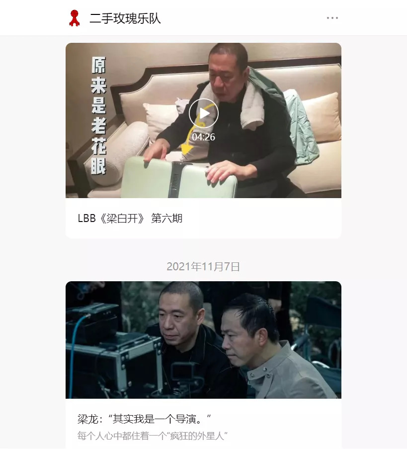 在音乐人自建的公众号中,二手玫瑰称得上是标杆,迄今已经发布434篇原创文章,分类细致。丰富素材源于乐队主唱梁龙本就是横跨音乐、综艺、影视、美妆等多个领域的跨界达人,其中,光是梁龙的视频谈话栏目就有《一本正经》和《梁白开》两种,内容从经典解读到仿妆分享几乎无所不包。最近,他们还开通了微信视频号,第一条视频就有1.3万点赞。