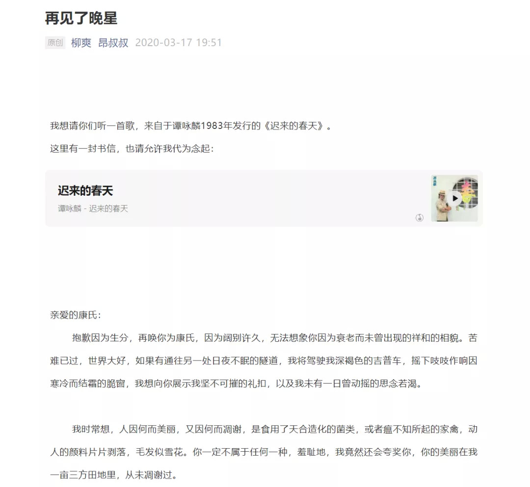 不久前爆火的《漠河舞厅》,之所以能凭借背后那个悲伤、沉重的故事引发关注,靠的自然不仅仅是短视频上几十秒的音画搭配,而更多源于柳爽在自己公众号上为那首歌写下的文学化故事《再见了晚星》。虽然推动短视频传播的是里面的“只言片语”,但也是因为长篇叙事本身所蕴含的强大情感能量。
