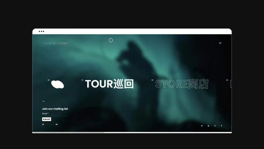 “TOUR巡回”是青色海水中倒映着黑色人影,“MUSIC音乐”是他们专辑《浪潮上岸》的封面,浅蓝色海水向墨蓝色海岸蔓延。极具海洋气息的页面设计和浮动光标,与他们的乐队风格十分贴合。视觉形象上的一致,是IP化的前提。