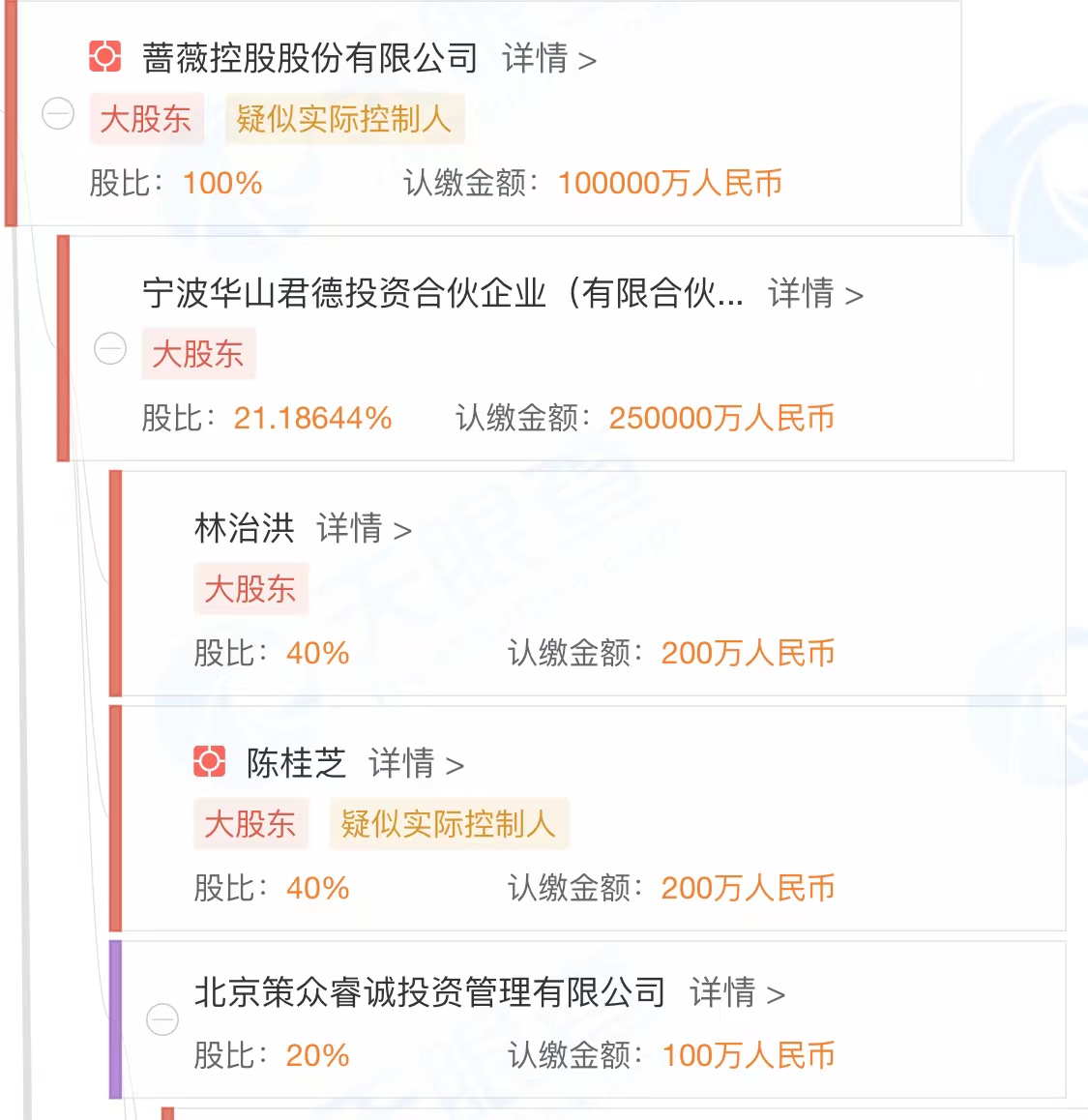 天眼查显示,蔷薇资本由林治洪担任董事长、总经理的蔷薇股份全资持股,其执行董事正是田中精机原董事长林治洪。穿透蔷薇股份股权结构,林治洪直接持股40%的宁波华山君德投资控股蔷薇股份;此外,中民投、信发集团、巨人网络(002558.SZ)等是蔷薇股份的股东。