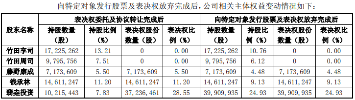 除了转让股份外,在表决权委托条件成就时,竹田享司、竹田周司还准备将其合法持有的田中精机24.72%的32,237,178股股份对应的表决权全权委托给上海翡垚投资行使;在表决权放弃条件成就时,竹田享司、竹田周司永久且不可撤销地放弃其所持上市公司的27,021,018股股份的表决权。
