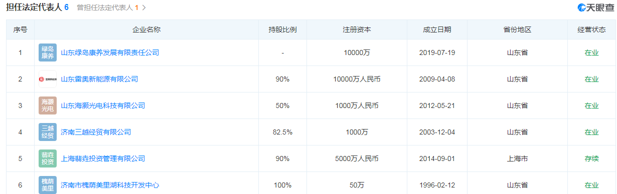界面新闻查询天眼查获悉,肖永富实际控制了14家公司,其中在山东绿岛康养发展有限责任公司(简称“山东绿岛康养”)、山东雷奥新能源有限公司(简称“山东雷奥新能源”)、山东海灏光电科技有限公司(简称“山东海灏光电”)、济南三越经贸有限公司(简称“济南三越”)、济南市槐荫美里湖科技开发中心及上海翡垚投资的法定代表人或董事长等职务。