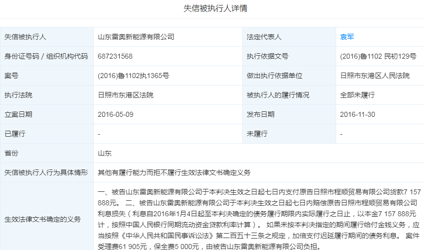天眼查显示,2016年,山东雷奥新能源曾因“其他有履行能力而拒不履行生效法律文书确定义务”,数次被最高人民法院公示为失信公司。此外,该公司曾因生产安全事故应急救援类、重大危险源管理类及安全设备使用维护及防护装备配备类违法等,于2016年至2018年数次遭当地监管部门行政处罚。