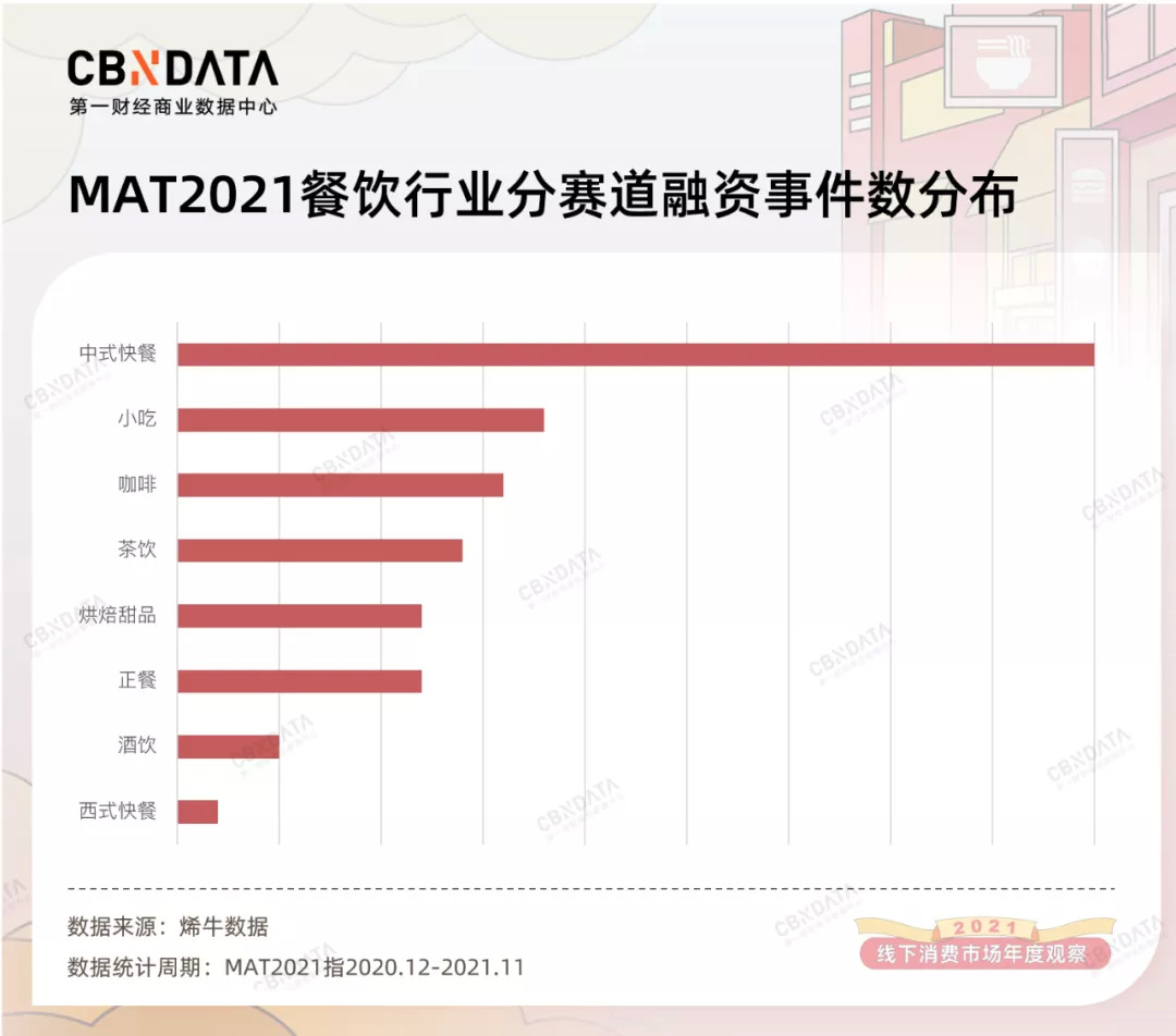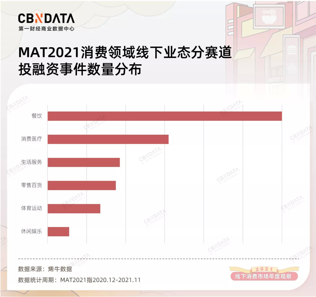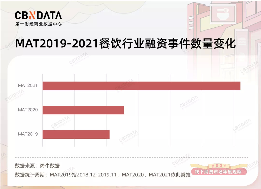 而具体到赛道,餐饮是线下业态中资本热度最高的领域,2021年投融资事件数是第二名“消费医疗”的近2倍。从时间线来看,2021年餐饮行业投融资事件数更是达到2019年的2.4倍。