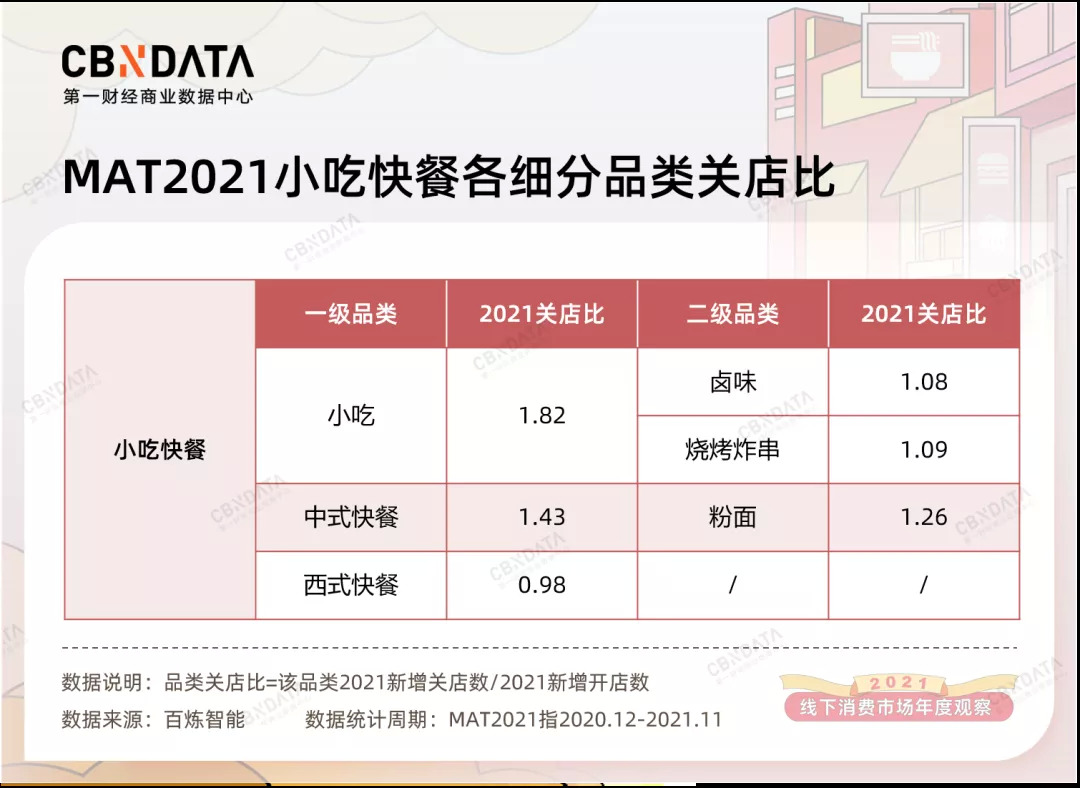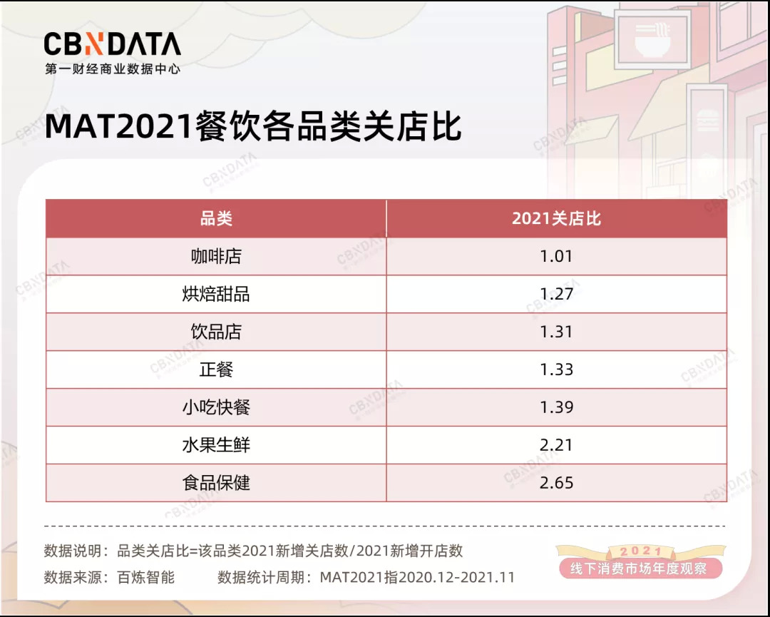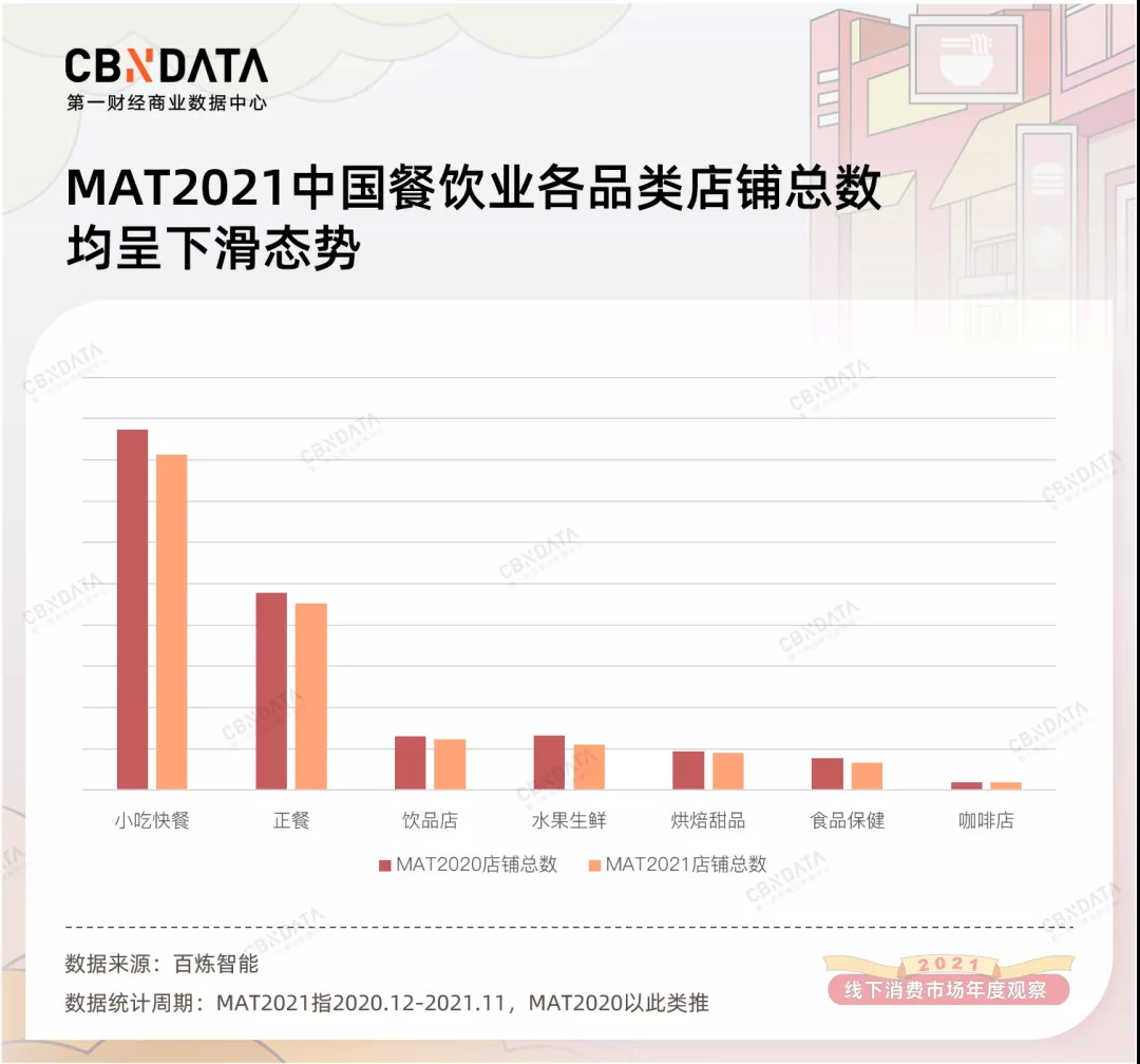 不论从社会零售贡献度还是从资本热度看,餐饮业都是2021年线下消费中当之无愧的“排头兵”。但值得注意的是,从门店数量来说,2021年餐饮各品类门店数较2020年均有明显下滑。