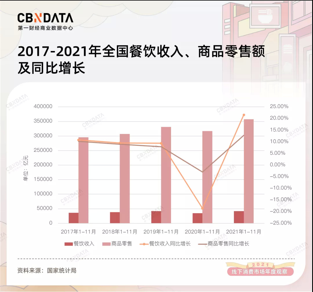 从消费类型来看,餐饮行业的复苏对线下消费的增长起到显著拉动作用。2020年1-11月,全国餐饮收入在疫情冲击下同比大跌18.6%。但到了2021年,在疫情依旧反复的情况下,全国餐饮收入强势反弹21.6%,回归2019年同期水平。