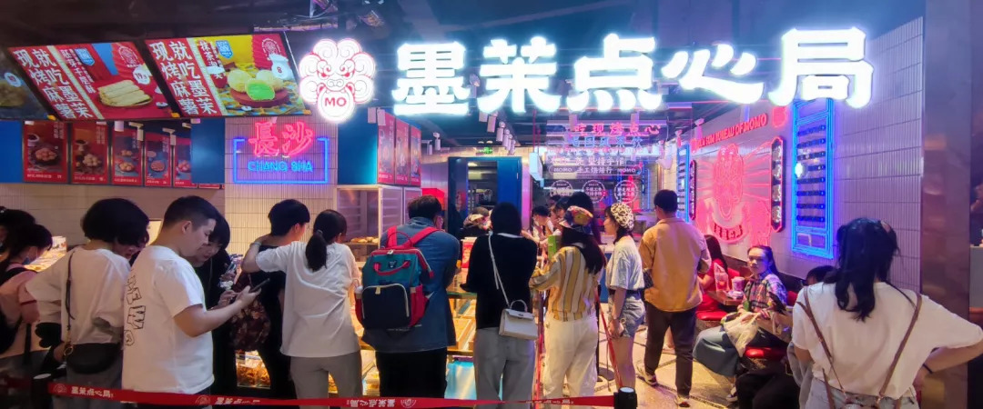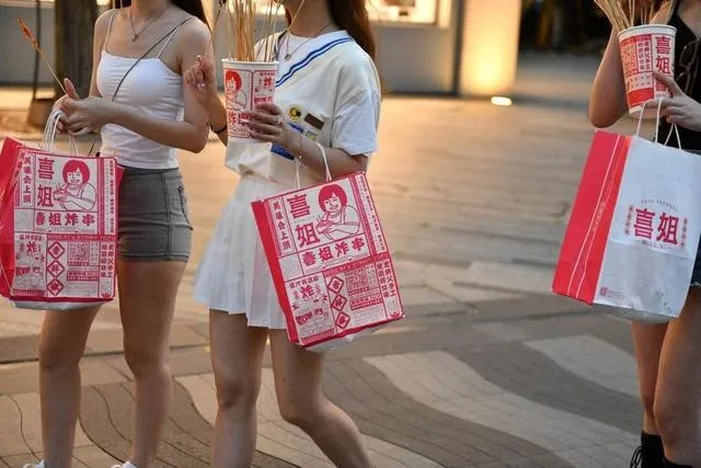 而那些门店面积狭小的品牌,有的通过极具辨识度的潮酷门脸设计,吸引过路消费者进店消费甚至自拍打卡,例如国潮画风的墨茉点心局、虎头局渣打饼行;有的则通过抓人眼球的外包装设计,让商品本身成为行走的广告牌,甚至是Z世代潮人逛街拍照的新道具,例如喜姐炸串。
