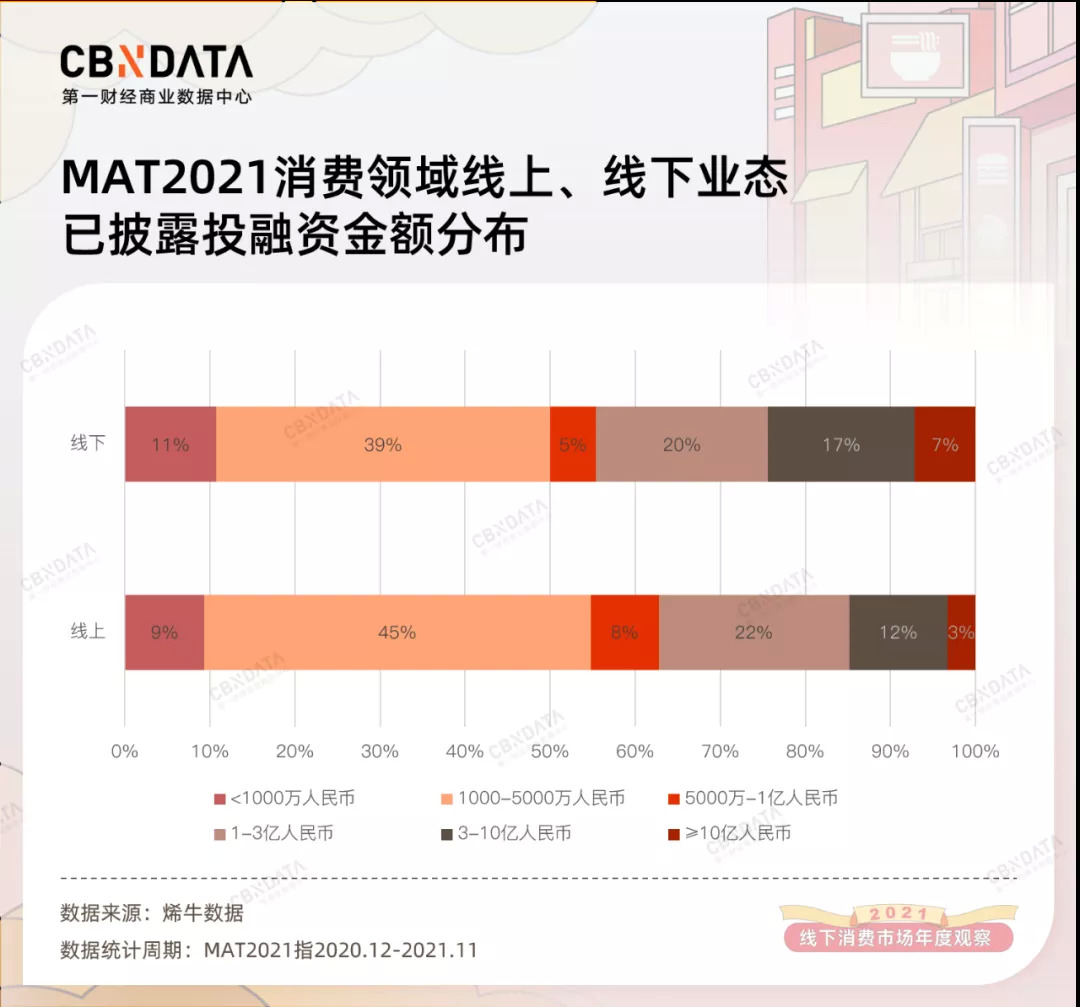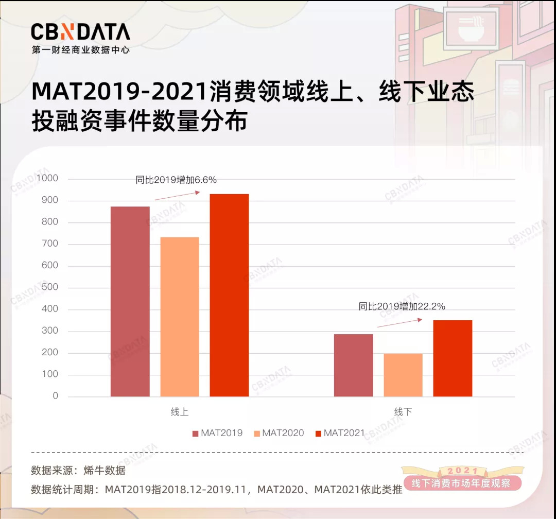 线下市场尤其是餐饮业的回温,也同样在资本热度方面得到印证。烯牛数据显示,2021年消费领域资本热度摆脱疫情阴影强势回温。其中,线下业态投融资事件数同比2019年大增22.2%,是线上增幅的超3倍。线下业态中大额融资事件(已披露融资金额在1亿元人民币以上)的占比,也比线上业态高出7个百分点。