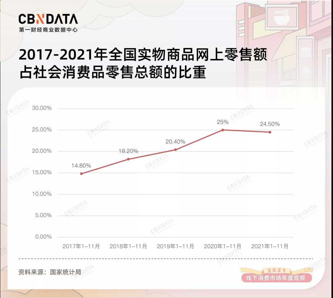 疫情最为严重的2020年,线下消费遭受严重打击,相反的,网络购物极速升温。网红直播、公益直播、县域“自救”直播等卖货方式热度空前,这直接推动2020年1-11月全国实物商品网上零售额历史性的达到社会消费品零售额四分之一的比重。而在2021年的1-11月,这个比重出现20年来的首次下降。这一方面意味着疫情重创下的线下消费在2021年得到复苏,另一方面也意味着线上消费在社会消费中比重的增长已然接近触顶。体量巨大的线下市场,将重新获得广大商业玩家的重视。