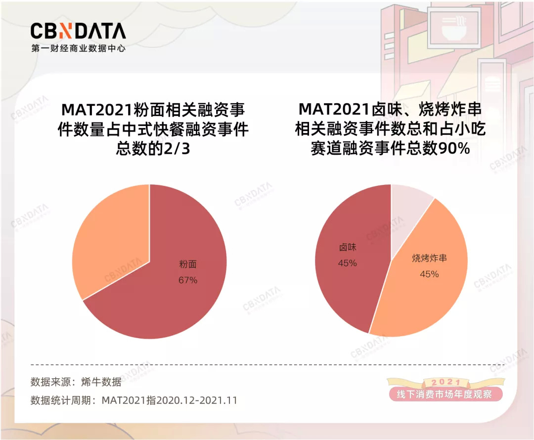 融资方面的数据表现也与此相一致。2021年,中式快餐领域发生的融资事件,在整个餐饮行业中遥遥领先,其中2/3的融资事件由粉面贡献。而在资本热度排名第二的小吃赛道,卤味、烧烤炸串相关融资事件加总,更是占据该赛道融资总数的九成。咖啡、茶饮、烘焙甜品的资本热度,也均在正餐之上。