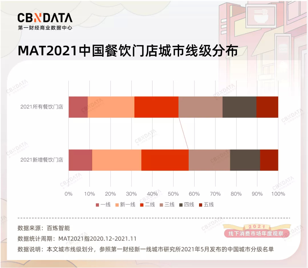 小餐饮“上行”的现象,从这一年的餐饮门店大数据中也可见一斑。百炼智能相关数据显示,2021年新增餐饮门店在一线、新一线、二线城市的分布比例,均高于整个大盘。餐饮业向高线级城市布局的倾向,叠加前文所述“小吃”“小喝”“小店”成为餐饮业领跑业态,使得餐饮品牌的选址升级成为必选项。