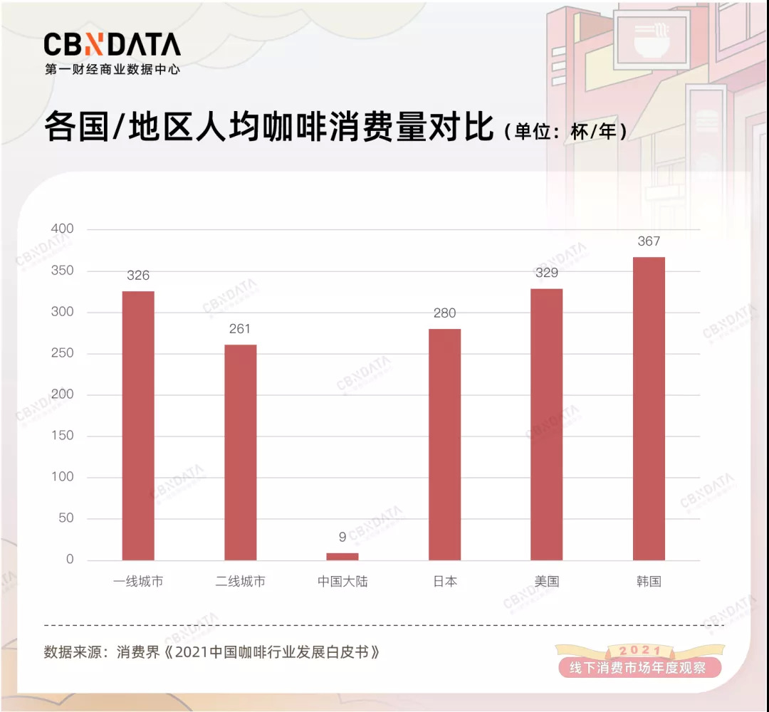 而在目光向下的品牌中,咖啡是下沉野心最大的品类。消费界发布的《2021中国咖啡行业发展白皮书》显示,中国一二线城市咖啡的渗透率已达67%,人均咖啡消费量已接近日、美、韩等成熟咖啡市场水平。但中国大陆整体的人均咖啡年消费量却只有9杯/人/年,这意味着下沉市场的咖啡消费增量空间巨大。而在市场供给端,德勤《中国现磨咖啡行业白皮书(2021)》显示,截至2020年底,中国10.8万家咖啡馆中,位于二线及以上城市的占比达75%,三线及以下城市精品咖啡馆的占比则不足1%。