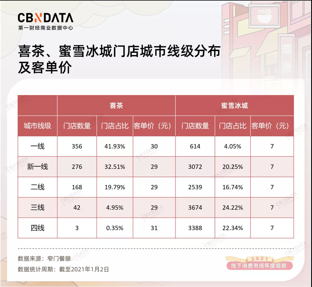 分别起家于安徽合肥、河南郑州的老乡鸡、蜜雪冰城,是二三线城市原生品牌中“上行”攻势最猛的代表。头顶极致性价比光环的蜜雪冰城,已经不满足于只讲下沉市场的故事。窄门餐眼数据显示,客单价仅7元的蜜雪冰城,位于一线/新一线城市的门店比例已接近25%。