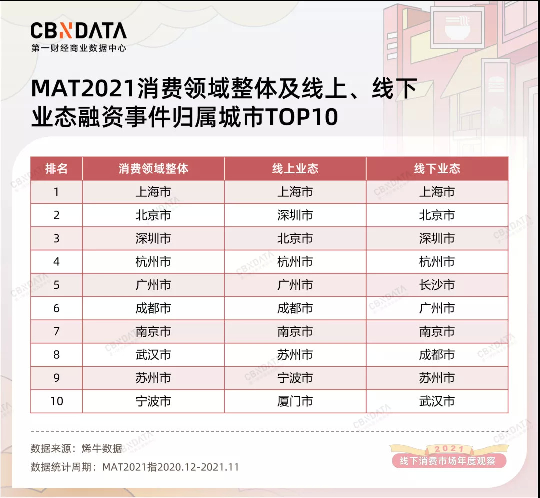 来到品牌层面,线下消费行业的品牌创业呈现出一定的地域特征。在整个消费领域以及线上消费赛道,上北深杭广稳稳占据2021获融资品牌TOP10归属城市中的头部席位。
