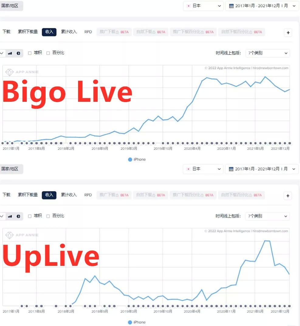以2017年进入日本的Bigo Live与UpLive为例,App Annie数据显示:Bigo Live在日本的收入从2017年到2019年初一直表现平淡,后来才开始表现出较强的增长趋势;UpLive则在2018年短暂地爆发过,随后又回落低谷,直到2020年重新表现出增长势头。