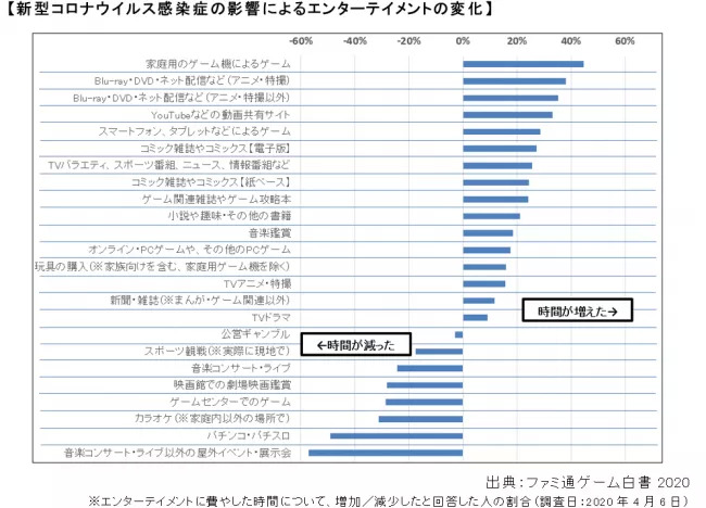 民众不得不在家中度过更长时间,游戏、动漫之外,用户需要更加多元的线上娱乐方式。根据日本2020年4月的一份调查,受疫情影响,日本民众花在各种娱乐项目上的时间发生了巨大变化。近40%的受访者表示,观看蓝光电影、网络直播等所花的时间有所增加。