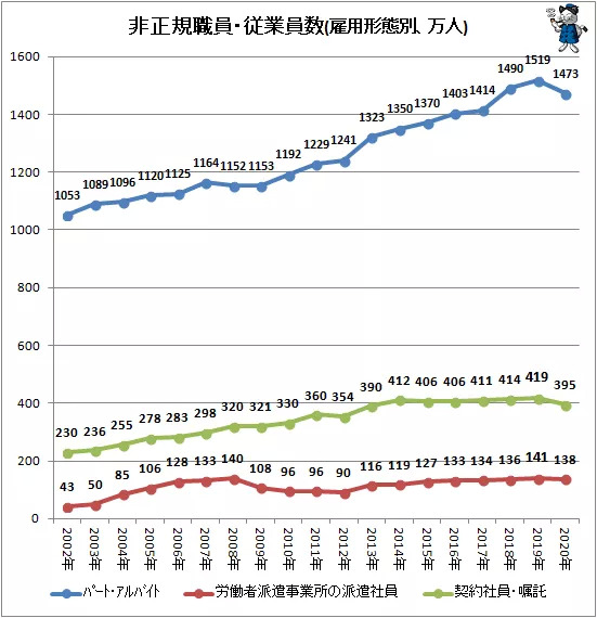 图源:Garbagenews,蓝色曲线表示日本兼职、打零工人数变化