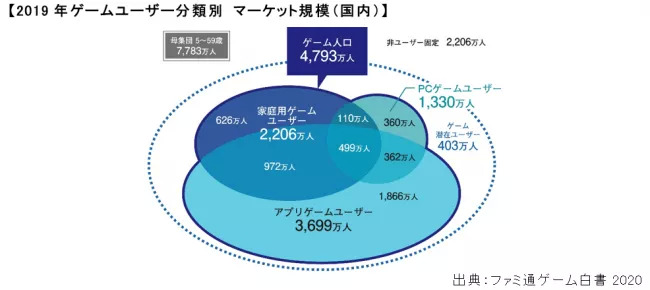 而日本的游戏产业又极其发达,占据了大部分用户的线上娱乐时间。调查显示,2010年至2019年,日本游戏市场呈现连续10年的快速增长。2019年市场规模达到1兆7330亿日元(约950亿人民币),相比2010年实现翻倍,游戏用户总数达到4793万人,占日本总人口的近40%。