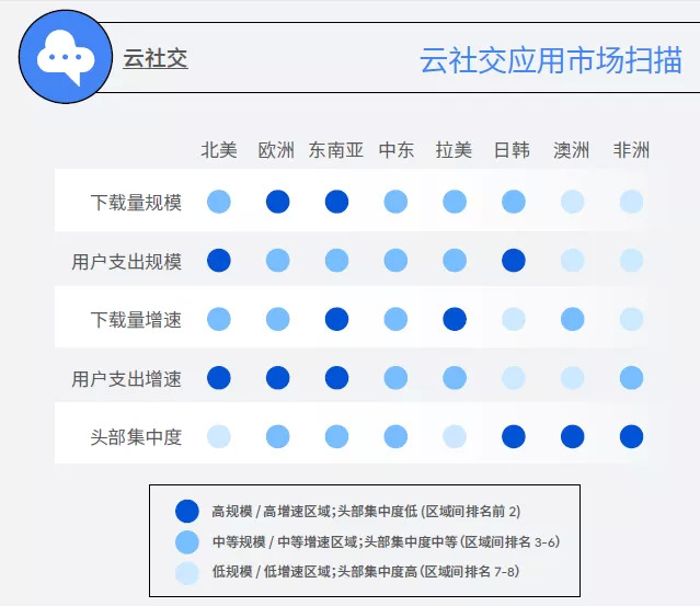 2021年11月,Google、Roland Berger、大观资本联合发布了《2021移动应用全球化指南》,将直播社交归类为“云社交”赛道,定义为“以线上消磨时间为主要目的的陌生人社交”。而日韩市场为“云社交”的高用户支出规模区域,头部集中度低。