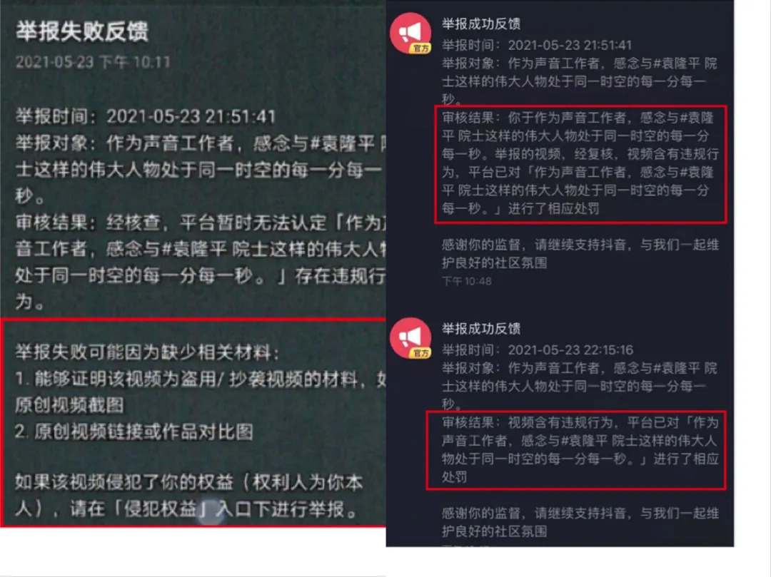 第一次,刘黎平举报视频非原创,抖音以“举报失败”作为处理结果,对侵权视频没有任何处理。