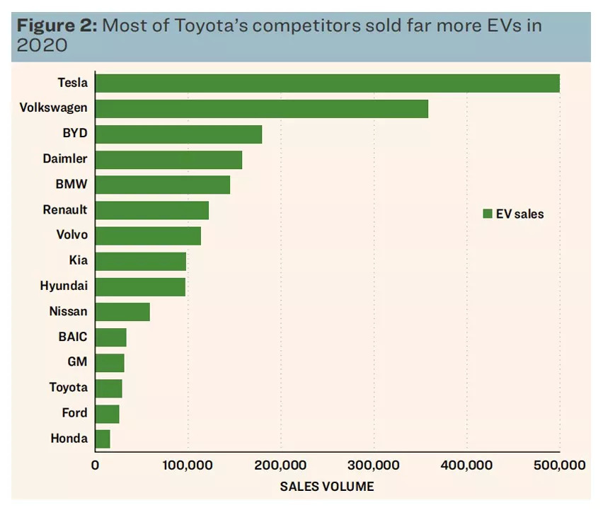 事实上,整个2020年,在燃油车时代横扫全球的丰田,只卖出去1.1万辆电动汽车,全球占比不到0.6%。