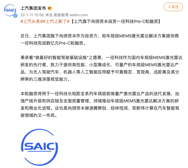 @上汽集团发布 微博1月11日消息,近日,车规级MEMS激光雷达解决方案提供商一径科技完成数亿元Pre-C轮融资。上汽集团旗下尚颀资本作为投资方之一。