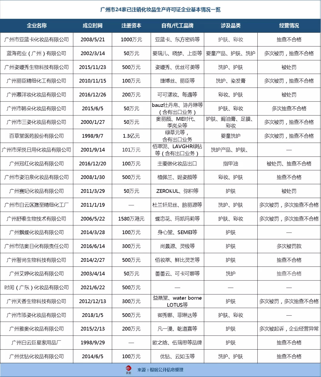 类似于广州市白云区激至精细化工厂、广州丽臣精细化工有限公司、广州市三姿化妆品有限公司、广州舒泰生物技术有限公司、广州天香生物科技有限公司等公司也曾多次被罚,且多次抽查不合格。经统计,这24家企业中,曾被抽查不合格的企业多达15家。