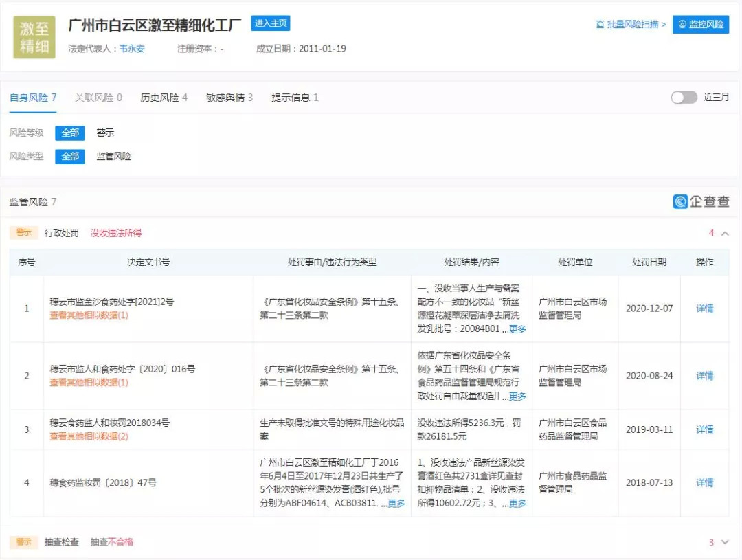 以广州市白云区激至精细化工厂为例,企查查显示,该公司分别在2018年7月、2019年3月、2020年8月和12月,因生产与许可批件配方不一致的产品、生产未取得批准文号的特殊用途化妆品、生产与备案配方不一致的化妆品等原因被处以罚款,这4次罚款金额共计约为17.83万元。不仅如此,该公司还分别在2018年、2019年和2020年被抽查不合格,被责令整改。