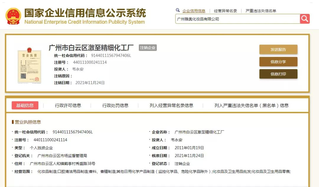根据国家企业信用信息公司系统显示,目前,广州市白云区激至精细化工厂已显示为“注销企业”。