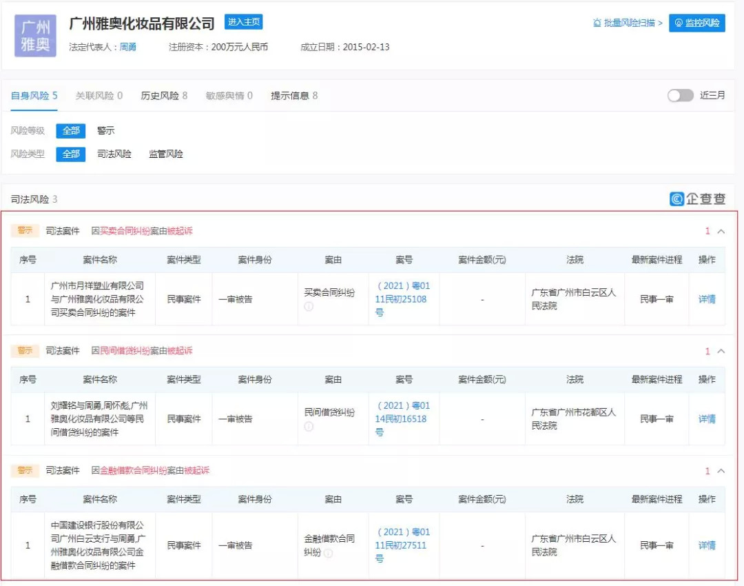 不仅如此,部分企业还存在着经营异常的情况或是被多次起诉。如广州雅奥化妆品有限公司,仅在去年一年就分别因金融借款合同纠纷、民间借贷纠纷、买卖合同纠纷等案由被多家公司和个人起诉,目前该企业已被列为“经营异常名录”。