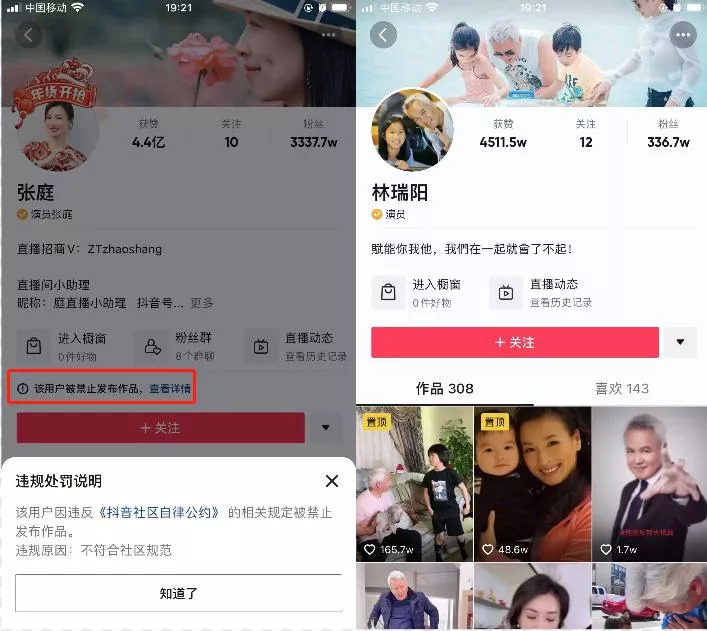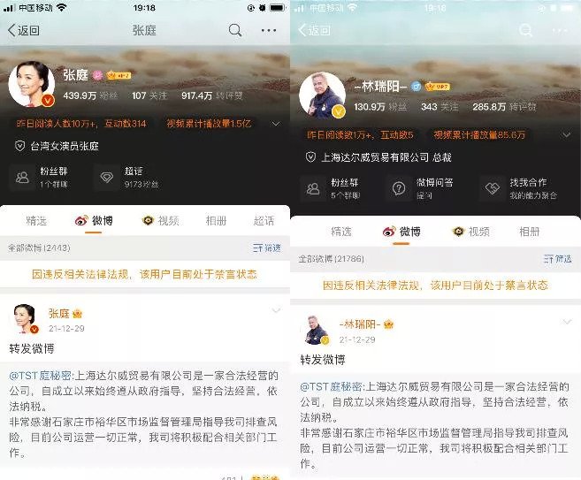 不止于此,目前TST创始人张庭、林瑞阳夫妇的微博账号均处于禁言状态,禁言原因为“违反相关法律法规”。据了解,张庭微博拥有439.9万粉丝,林瑞阳则拥有130.9万粉丝。而在抖音,张庭因违反《抖音社区自律公约》的相关规定被禁止发布作品,违规原因为“不符合社区规范”,其粉丝数为3337.9W。拥有336.7万粉丝的林瑞阳抖音账号虽未被禁言,但近半个月以来未见其更新抖音作品,而此前更新一条作品的频率在3到5天之间。