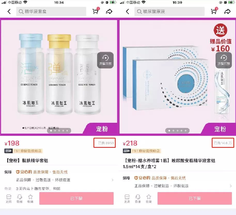 不过,青眼根据“TST庭秘密官方”抖音店铺评价一栏了解到,该店铺还曾售卖过【宠粉】靓肤精华套组/198元、【宠粉-赠水养喷雾1瓶】玻尿酸安瓶精华液套组/218元等多类别的TST品牌旗下产品。其中,【宠粉】靓肤精华套组显示已售8951件、【宠粉-赠水养喷雾1瓶】玻尿酸安瓶精华液套组则显示销售高达14.6万件。目前上述产品均显示已经下架。