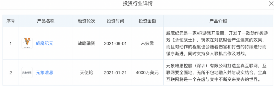 天眼查显示,刚刚过去的2021年,腾讯投资过两家VR/AR性质的企业,分别是威魔纪元和元象思维。