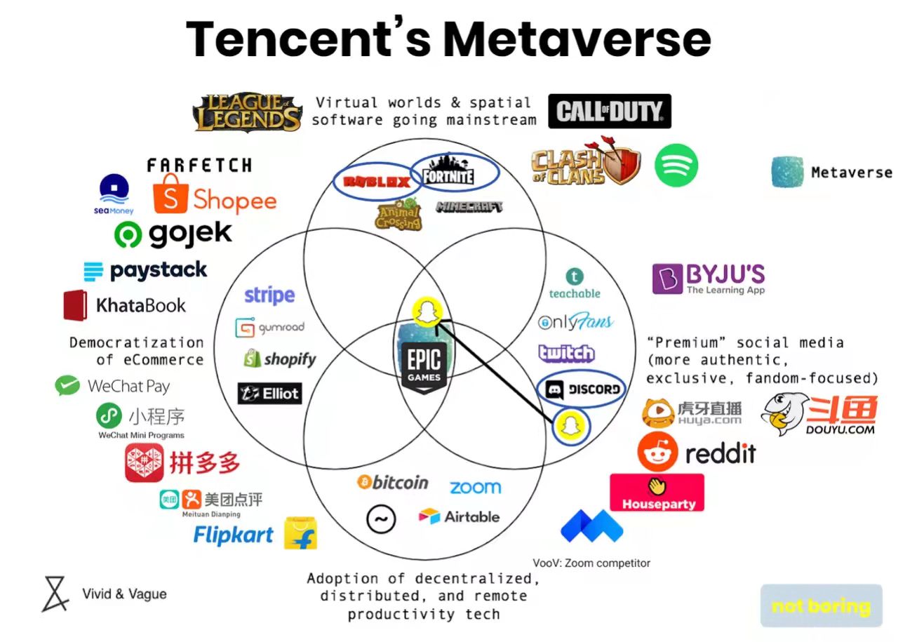 国外媒体曾制作过“Tencent's Metaverse”(腾讯元宇宙)完整产业图。这其中不仅有英雄联盟等游戏,也有拼多多、美团等电商购物平台。