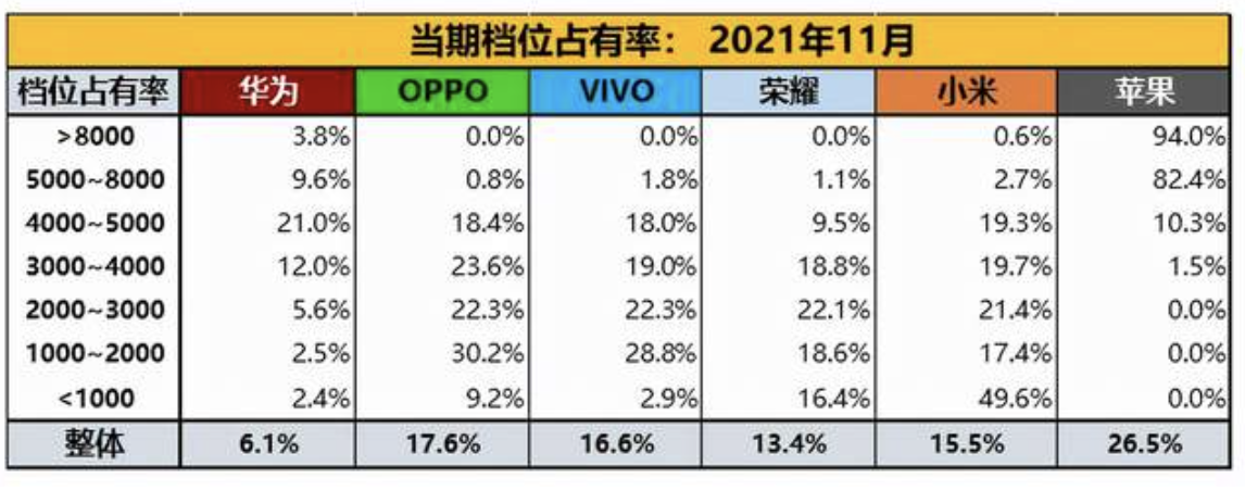 根据网友@安乎都护府长史 提供的市场零售数据,2021年11月,国内手机市场高端档位的品牌集中度同比再次提升,5000元~8000元档位、8000元以上档位集中度分别为98.5%、97%,其中苹果占据绝对优势。