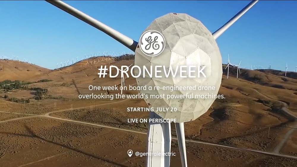 2015年7月20号,GE以#DRONEWEEK为主题,发起了为期五天的无人机直播。从美国的东海岸到西海岸,GE对企业的前沿行业进行了全面深度的介绍,如深海钻井、风力发电等。同时,GE在社交媒体上也在解答在线观众的问题,如:风车每天的发电量是多少?工人们站在百米高的支架上,会不会恐高?