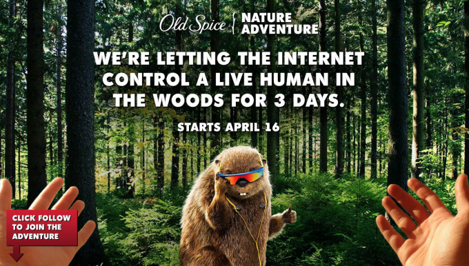 比如在2015年4月,一向擅长恶搞营销的宝洁旗下男士香氛品牌Old Spice,就在游戏直播平台Twitch上发起了一个不同寻常的直播:找来一个人在野外丛林里生活三天,行为完全由用户控制。就像打游戏一样,用户通过聊天输入上下左右按键来控制人物下一步动作,然后统计所有用户的选择,票数最高的动作就会成为这个人下一步的行动。