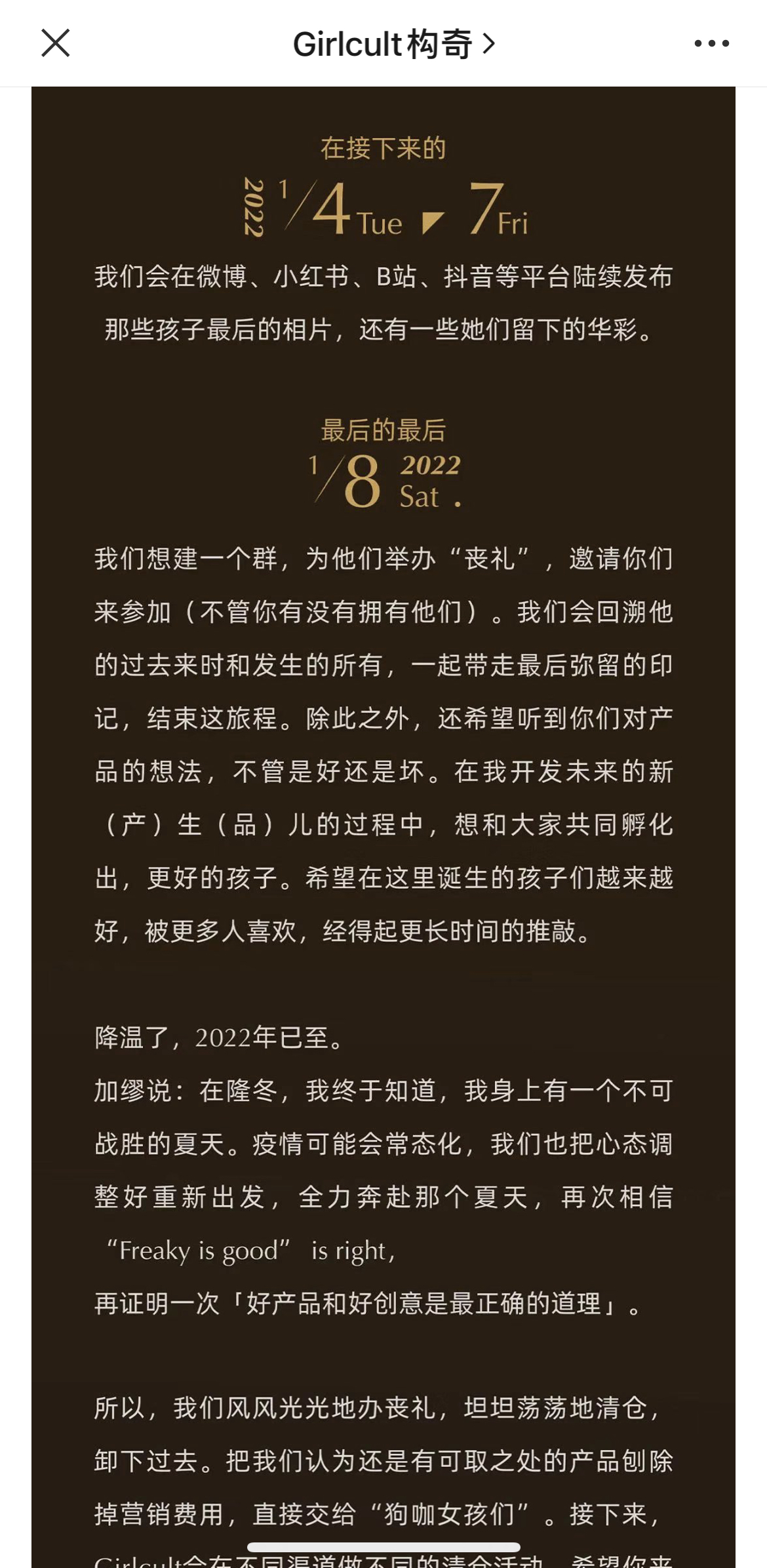 由于文案的笔触真情实意,而清仓活动又充满着仪式感,界面时尚看到,不少消费者在Girlcult构奇品牌文章评论区表示“感动”,还鼓励品牌“加油”、“坚持下去”。