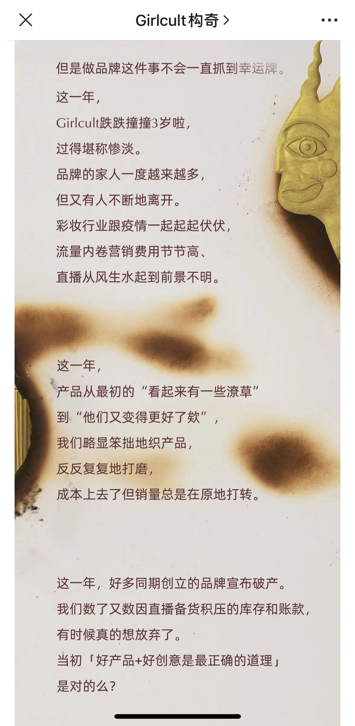 Girlcult构奇在文中提到过去一年本土彩妆市场的变局带来的影响,并表示“我们数了又数因直播备货积压的库存和账款,有时候真的想放弃了。”